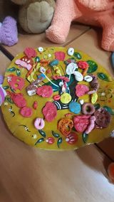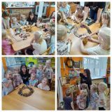 Продуктивная деятельность: лепка: «Помогаю маме печь оладушки для гостей», «Пирожки для гостей», аппликация «Цветочки счастья».